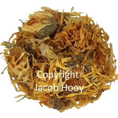 Gedroogde Goudsbloem (Calendula officinalis), een traditioneel kruid met een rijke geschiedenis in natuurlijke verzorging en kruidengeneeskunde.