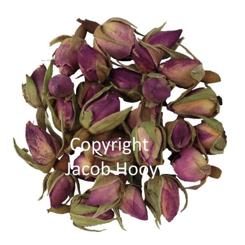 Gedroogde, hele roze rozenknopjes van Jacob Hooy. Puur natuur en ideaal voor gebruik in thee, potpourri of decoratieve toepassingen.
